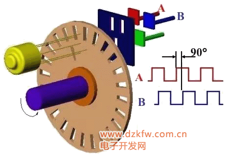 光敏元件所產(chǎn)生的信號A、B彼此相差 90°相位,用于辨向。當碼盤正轉(zhuǎn)時,A信號超前B信號0°;當碼盤反轉(zhuǎn)時,B信號超前A信號90°。