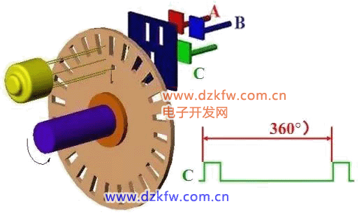 在碼盤里圈,還有一條狹縫C,每轉(zhuǎn)能產(chǎn)生一個脈沖,該脈沖信號又稱“一轉(zhuǎn)