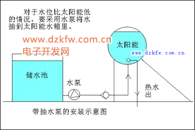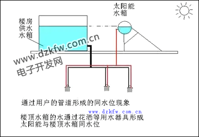 一般的電磁閥打開需要一定的壓力的,一般是0.02兆帕(0.2公斤),自然落水高低差應大于2米,如低于這個數值,水就無法流過去了,在城鄉自建的房子中往往建有自備水箱,水箱的水位高度應大于太陽能水箱的高度2米以上,才能通過一般的電磁閥正常供水。目前市面上還有一種無壓電磁閥(見第七章圖7-4-4),裝上就可以滿足以上供水條件。這時備用水箱的最低水位也要比太陽能水箱的最高水位高0.5米以上。
