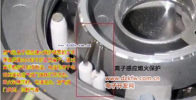 燃氣灶離子感應熄火保護裝置的工作原理是通過火焰中的正負離子,通過離子感應針形成電流,電流作用于電磁閥驅動進氣閥門保持打開狀態;當火焰熄滅時,電流消失,進氣閥門關閉,切斷氣源。