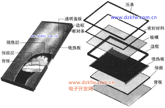 平板式集熱器是太陽能低溫熱利用的基本部件,也一直是世界太陽能市場的主導產品。平板式集熱器一般由透明蓋板、吸熱板、保溫層、隔熱層和背板等組成,吸熱體多為具有高吸收比及低發射比膜層的金屬條帶。國外成熟的集熱器都是 平板式集熱器。