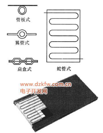 在平板形狀的吸熱板上,通常都布置有排管和集管。排管是指吸熱板縱向排列并構成流體通道的部件;集管是指吸熱板上下兩端橫向連接若干根排管并構成流體通道的部件。吸熱板的材料種類很多,有銅、鋁合金、銅鋁復合、不銹鋼、鍍鋅鋼、塑料和橡膠等。吸熱板有四種形式,即管板式、翼管式、扁盒式和蛇管式,如下圖所示。