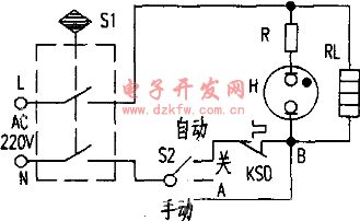 該機(jī)由茶壺(內(nèi)裝KSD溫控器、電熱盤RL、環(huán)形電極等)和底座(內(nèi)裝重力開關(guān)S1、功能選擇開關(guān)S2、指示燈H與茶壺的環(huán)形電極相接觸的彈力式電極等)兩大部分構(gòu)成。測繪電路原理圖如附圖所示,KSD溫控器功能見附表所示。