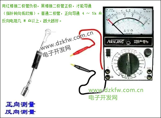 測量二極管好壞,用萬用表的電阻檔,斷開電路單獨測。因為萬用表的紅棒通表里電池負極。所以用紅棒接二極管負極,黑棒接二極管正極,才能導通(指針轉向低歐姆)。普通二極管,正向導通 4 ~ 5k Ω,反向電阻幾 M Ω以上,越大越好。
