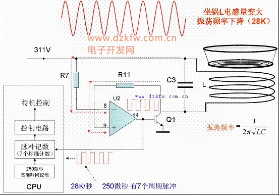 圖2所示;就是脈沖鍋檢的電路原理圖;這個在坐鍋時的振蕩頻率為28K;經過比較器電路U2B的(14)腳輸出28K頻率的方波;這個方波除了去激勵IGBT功率管之外,還送往電磁爐的CPU控制電路中的脈沖計數電路。脈沖計數電路對U2B(14)腳送來的振蕩信號進行以250微秒為一個時間段;對振蕩信號進行取樣計數,如果坐鍋時;振蕩頻率為28K/秒,那么在250微秒的時間段,就能檢測到7個振蕩周期的方波。此時CPU內部的脈沖計數電路也是以250微秒時間端7個脈沖標準計數(考慮到鍋的差異及鍋放置位置的差異可以對6至8個脈沖的計數都屬于正常計數范圍,也就是坐鍋時;振蕩頻率可以由24K到32K范圍都正常)。這時計數電路在250微秒計數,通過的脈沖數7個正常,電路則維持啟動正常工作繼續對鍋及食品加熱。