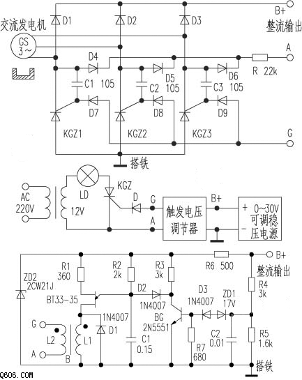 此電路由單結(jié)晶體管BT組成的同步張弛振蕩器及三極管BG組成的檢測控制電路組成。當B+端接上電源時,通過限流電阻R6及穩(wěn)壓管ZD2給振蕩器供電,電源經(jīng)電阻R2對電容C1充電,當G1兩端的電壓升到單結(jié)晶體管BT的峰值電壓時,BT的e、b1極導通,電容C1經(jīng)BT的e、b1極向隔離變壓器的初級L1放電。當C1的電壓下降到BT的谷點時,BT的e、b1極恢復阻斷。然后電容C1便開始第二次充/放電,如此循環(huán)。電路起振后,通過隔離變壓器B的L2輸出脈沖,經(jīng)G、A端加到可控硅的觸發(fā)極而使可控硅導通。由于電源取自三相整流的脈動電源,因而輸出的脈沖同步于脈動電源,可以使可控硅被同步觸發(fā)。當B+端的電壓達到或超過28V時ZD1擊穿導通,BG基極電位升高,BG導通,集電極電位降低,二極管D2導通,使C1兩端短路,振蕩器停振,可控硅得不到觸發(fā)信號,在過零時被阻斷。當電壓低于28V時,ZD1不被擊穿,BG基極為低電位,BG截止,其集電極為高電位,D2截止,振蕩器工作,可控硅被觸發(fā)而導通,整流器輸出電流向外供電。就這樣周而復始,始終使發(fā)電機的整流輸出電壓不超過28V。如果觸發(fā)電流偏小,可以適當減小圖1中R的阻值。電路中電阻全部選用1/2W的金屬膜電阻,B選用∮25mm的磁罐或截面積為0.5~0.8c㎡的收音機變壓器鐵心,用∮0.23~∮0.25mm的漆包線,L1繞100T,L2繞200T。