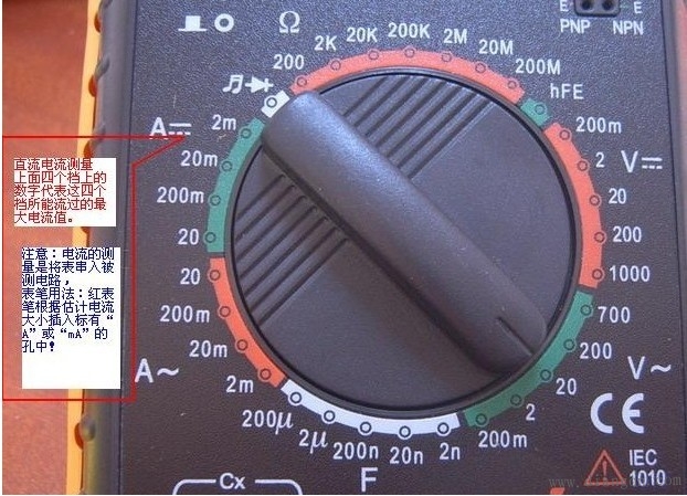 交流電流的測量。測量方法與1相同,不過檔位應該打到交流檔位,電流測量完畢后應將紅筆插回“VΩ”孔,若忘記這一步而直接測電壓,哈哈!你的表或電 源會在“一縷青煙中上云霄”--報廢!