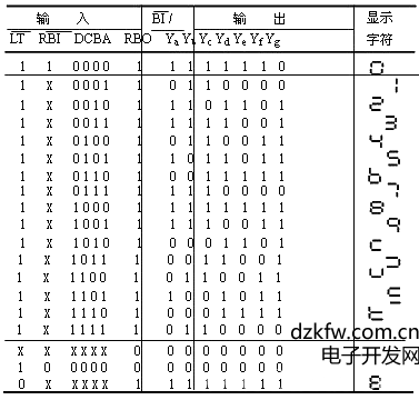 此時BI/RBO端作為輸入端,該端輸入低電平信號時,表1倒數第3行,無論LTRBI輸入什么電平信號,不管輸入DCBA為什么狀態,輸出全為“0”,7段顯示器熄滅。該功能主要用于多顯示器的動態顯示。