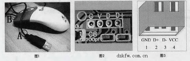 將 USB接口向下, 把鼠標 uSB插頭金屬外殼帯有兩個方型口的一面面對自己(如圖3所示),從左到右,USB接口內四個金手指依次為;電源地、數據正、數據負、電源正。