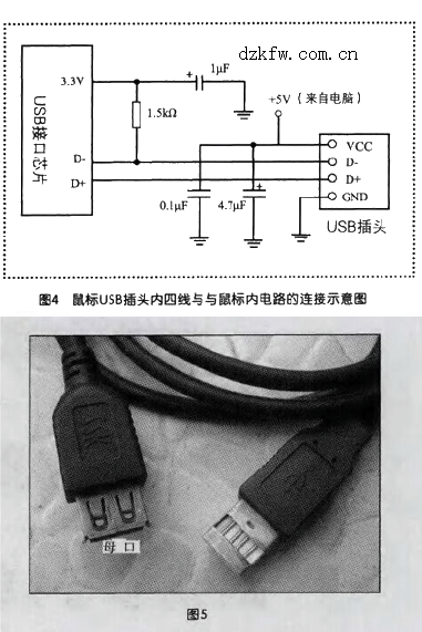 一般鼠標內電路板上接口芯片都會提供3個引腳來連接 uSB鼠標括頭,分別是3.3V的電平輸出腳;D+1 D-。如圖4所示,括頭插入才有5V, 5V和接口芯片與外圍電路正常才會產生3.3V, D一才有3V左右的電壓。