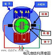 電風扇的主要部件是:交流電動機。其工作原理[1] 是:通電線圈在磁場中受力而轉動。電能轉化為機械能,同時由于線圈電阻,因此不可避免的有一部分電能要轉化為熱能。此外,直流電機、直流無刷電機等小功率電機在小型電扇中的應用也越來越廣泛。