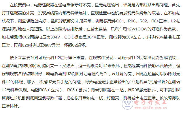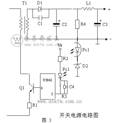 在用萬用表測量次級元件,排除了高頻整流二極管擊穿、負載短路的情況后,如果這時輸出為零,則可以肯定是電源的控制電路出了故障。若有部分電壓輸出說明前級電路工作正常,故障出在高頻整流濾波電路中。高頻濾波電路主要由整流二極管及低壓濾波電容組成直流電壓輸出,其中整流二極管擊穿會使該電路無電壓輸出,濾波電容漏電會造成輸出電壓不穩等故障。用萬用表靜態測量對應元件即可檢查出其損壞的元件。例:某一24伏直流電機供電電源通電后無直流24伏輸出 ,拆開電源外殼,觀察保險絲未燒斷且電路板無明顯的燒焦處或破裂元件,在未通電情況下量AC輸入端阻值和DC輸出端阻值正常,量開關管、整流橋、整流管等重要元件正常,故判斷不存在內部嚴重短路的可能,估計保護電路動作。經檢查此開關電源采用U3842 PWM控制芯片,經查找相關的資料得知,當U3842芯片的3端電壓高于1伏時,內部電流敏感比較器輸出高電平,將PWM鎖存器復位使輸出關閉。通電測量U3842的3端高于1伏,6端無輸出,經檢查相關電路,發現穩壓管D2擊穿,如圖3,故PC1導通,致使U3842的3端為高電平,故6端無輸出,開關管不工作,直流側無直流輸出。更換同型號穩壓管D2,故障解除。電源負載能力差電源負載能力差是一個常見的故障,一般都是出現在老式或工作時間長的電源中,主要原因是各元器件老化,開關管的工作不穩定,沒有及時進行散熱等。應重點檢查穩壓二極管是否發熱漏電,整流二極管損壞、高壓濾波電容損壞等。