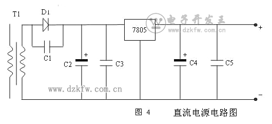 例:我廠近紅處激光光譜儀(VECTOR 22),開機后無法完成自檢并報警且主板指示燈不斷閃爍。經檢查,供光譜儀主板的直流5V電源僅剩2.3伏左右,脫開5V直流電源的負載,通電再次測量5V直流電源,這時則有5V,初步判斷此5V直流電源帶載能力差,拆開電源外殼進行檢修,由于沒有帶負載時,通電有直流5V輸出,故重點檢查次級線圈側的輸出整流電路,給5伏電源接上假負載通電進行測量發現三通穩壓7805的1、2腳之間電壓為5.2伏,2、3腳之間卻剩2.3伏,如圖4,故判斷三通穩壓管7805性能變壞,更換三通穩壓管7805故障解決。