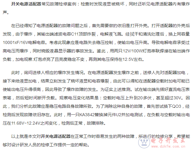 維修方法:對于這種故障我們可以根據以上故障原因,來逐一進行排查。但在實際維修時,可根據實際情況來進行排查,不一定要逐一排查。首先用萬用表檢查一下高壓直流濾波電容是否變質,容量是否下降,能否正常充放電。如無以上現象,則測量一下開關功率管的柵極(G極)的限流電阻以及源極(S極)的過流保護檢測電阻是否變值,變質或開焊,接觸不良。經判別后,若無問題,我們就檢查一下高頻變壓器的鐵芯是否完好無損。因在日常生活使用中,不可避免的重摔或重幢,使高頻變壓器的鐵芯損壞。使高頻變壓器的磁通量,磁感應強度,以及磁路等都會受到很大的影響,造成傳輸的效率,能量將會大打折扣。由于高頻變壓器為了減小渦流,增大高頻交流電的傳輸效率,它的鐵芯是用軟磁鐵氧體制作而成的。這種磁性材料具有高的導磁率,但質脆,易碎。因此它的損壞率也是很高的。因此在維修時千萬不要忘了檢查此處,以免走彎路。除此之外還有可能就是輸出濾波電容容量降低,甚至失容或開焊,虛接;電源輸出限流電阻變值或虛接,電源輸出線虛接等。在實際維修時,這些因素都不要放過,都應檢查一下,以保證萬無一失。