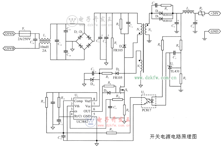 220V的交流電經交流濾波電路濾除外來的雜波信號,同時也防止電源本身產生的高頻雜波對電網的干擾。再經二極管橋式整流電路和濾波電路,整流濾波后得到約300V的直流電,送給功率變換電路進行功率轉換。功率變換電路中的開關功率管(IGBT)就在脈沖寬度調制(PWM)控制器(UC3842)輸出的脈沖控制信號和驅動下,工作在“開”“關”狀態,從而將300V直流電切換成寬度可變的高頻脈沖電壓。把高頻脈沖電壓送給高頻變壓器,高頻變壓器的次級(二次側)就會感應出一定的高頻脈沖交流電,并送給高頻整流濾波電路進行整流,濾波。經高頻整流濾波后便可得到我們所需的各種直流電壓。輸出電壓下降或上升時,由取樣電路將取樣信號通過光電耦合器(PC817),送入控制電路,經過其內部調制,由控制電路的輸出端將變寬的或變窄的驅動脈沖送到開關功率管的柵極(G極),使變換電路產生的高頻脈沖方波也隨之變寬或變窄,由此改變輸出電壓平均值的大小,從而使直流電壓基本穩定在所須的電壓值上。開關電源的電路原理圖如下: