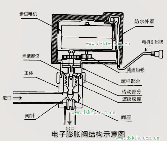 電子膨脹閥屬比較精密節(jié)流元件,它由一只五線(或六線)的步進電機作為開關膨脹閥芯的動力元件。而步進電機在控制系統(tǒng)中,可以把脈沖信號轉換成角位移運動,并且它還可以作為電磁制動輪,進行實時定位。