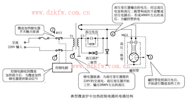 下圖是典型的微波爐加熱控制電路的電路結構。圖中右側就是高壓部分的電路。