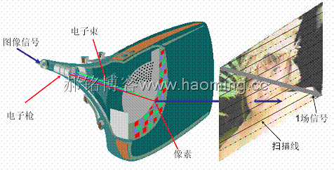 顯像管:俗稱CRT,它是一個(gè)電真空器件,由涂有熒光粉的屏、電子槍及一個(gè)真空的腔體組成,是一個(gè)體積較大的玻璃椎體。成像原理是;依靠電子槍發(fā)射高速電子束流;轟擊熒光屏產(chǎn)生光點(diǎn);圖像信號(hào)的控制使電子束流強(qiáng)弱變化,在熒光屏上產(chǎn)生“亮”、“暗”變化的光點(diǎn)(這光點(diǎn)就是像素);再依靠偏轉(zhuǎn)作用使電子束在熒光屏上進(jìn)行規(guī)定的掃描,把“亮”、“暗”變化的光點(diǎn)按規(guī)定的順序排列起來(lái)形成圖像,如圖1-1-1所示。顯像管屬于顯示屏主動(dòng)發(fā)光的模擬顯示器件。