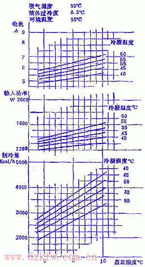 下圖為名義制冷量3000大卡/時某窗式空調器所采用的日立牌WAll3AX壓縮機性能曲線。例如:吸氣溫度為35℃、環境溫度為35℃、過冷溫度為8.3℃時,蒸發溫度為5℃、冷凝溫度為55℃,從壓縮機性能曲線可查出制冷量為3040大卡/時(3.53KW),電流為6.25安,輸入功率約為1440瓦。