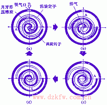 在兩渦旋之間構成四個壓縮腔,每個壓縮腔呈月牙形。下圖(a)為吸氣終了壓縮腔的狀態。之后渦旋轉子每隔90度轉角順時針作圓周軌道運動,其情況分別見下圖(b)、(c)、(d)、最后到(d)完成一個周期。