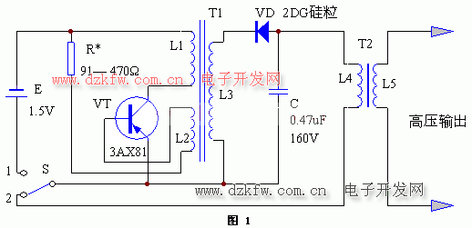 E采用一節(jié)5號(hào)電池。VT采用鍺三極管3AX81,以改善低電壓下的壓降特性,如用硅管則壓降較大,工作效率明顯降低。VD采用2DG系列高壓硅粒,其反壓要求大于250V,C的容量在0.47—0.68uF范圍,耐壓大于160V。T1可用小型半導(dǎo)體收音機(jī)中的輸入或輸出變壓器的E型5×7鐵芯,L1用Φ0.17mm高強(qiáng)度漆包線繞30匝,L2用同樣線徑的漆包線繞60匝,L3采用Φ0.06mm的高強(qiáng)度漆包線繞3500匝。T2采用40mm長(zhǎng)的磁棒作鐵芯,首先用Φ0.41mm的漆包線在磁棒上繞17匝作L4,然后在L4上套入塑料槽骨架,并用Φ0.06mm的高強(qiáng)度漆包線在骨架上繞1500匝。骨架上共分線槽10個(gè),每個(gè)線槽內(nèi)繞150匝,可有效防止高壓擊穿L5自身。