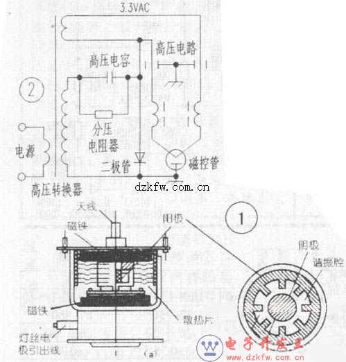 其工作原理是:存接通電源后,高壓變壓器次級燈絲線圈兩端產生的3.3V交流電給磁控管燈絲供電。與此同時,高壓繞組產生的約2000V交流高壓經高壓電容限流,二極管整流后得到約2000V的直流高壓加至磁控管陽極,形成加速電場(陽極接地,實際卜是陰極為負2000V,見圖2),使陰極(分直熱式和間熱式兩種,圖2中為直熱式)發射的電子向陽極加速運動。在電子向陽極加速運動的過程中還要受到永久磁鐵所形成的垂直方向上的強磁場作用,因此電子是邊旋轉邊向陽極加速運動(就像子彈在槍管中的運動一樣),旋轉速度也不斷變快。陽極做成內齒輪狀(見圖1b),形成偶數個空腔,稱為諧振腔。每個諧振腔就是一個微波諧振器,其諧振頻率取決于諧振腔尺寸。電子存通過扇形諧振腔時會發生振蕩,且頻率不斷升高。當頓率達到2400MHz以后便形成微波,由波導管口發射,再傳輸到爐膛內對食品加熱。