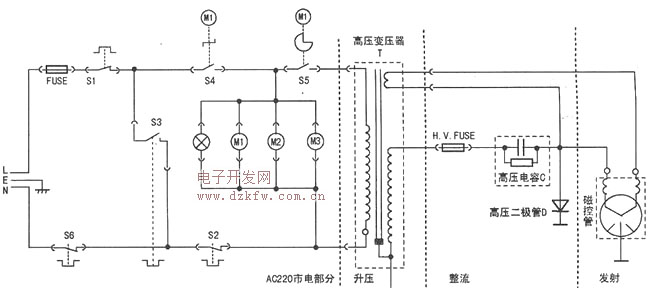 機(jī)械式微波爐的電控部分主要由四部分組成,一是市電供給部分,由電源插頭,市電保險(xiǎn)絲FUSE,開關(guān)和電線等組成;二是升壓部分,主要由升壓變壓器T組成;三是整流部分,由高壓保險(xiǎn)絲H.V.FUSE,高壓二極管D,高壓電容器C等組成;四是微波產(chǎn)生部分,主要由磁控管和波導(dǎo)裝置組成,如上圖所示。