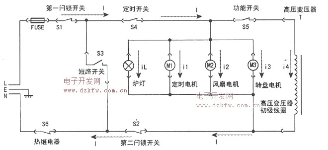 當(dāng)關(guān)上爐門后,定時(shí)器打開。S3被下門鉤推開,呈開路狀態(tài),在電路里不起作用,此時(shí)市電電路中的電流如下圖所示,干路電流標(biāo)為I,各并聯(lián)支路里電流標(biāo)為i。干路里電流I回路如下:電源L→FUSE→第一閂鎖開關(guān)Sl→定時(shí)開關(guān)S4→五個(gè)并聯(lián)支路(iL、il-i4)→第二閂鎖開關(guān)S2→熱繼電器S6→回到電源線N,則電流I=il,+il+i2+i3+i4。