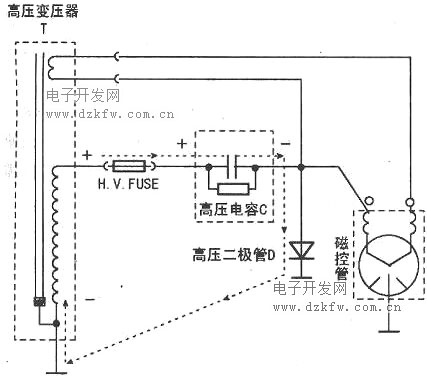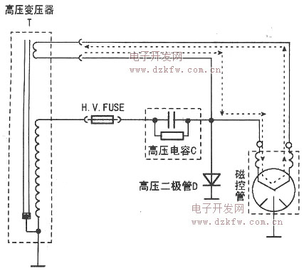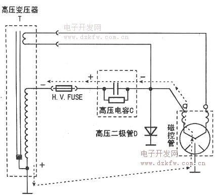 一是市電回路,220V交流電經(jīng)保險(xiǎn)絲、電機(jī)、升壓變壓器初級后流回插座。二是燈絲回路,升壓變壓器的一個(gè)次級繞組輸出約3V交流電,供給磁控管燈絲。只有燈絲加熱陰極,陰極才能發(fā)射電子。上面兩個(gè)回路流的是交流電。第三個(gè)回路是高壓回路,流的是高頻高壓脈動直流電。