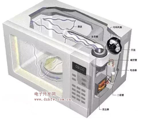 變壓器、二極管和電容器將民用電從220V提升到3,000V以上,通過(guò)導(dǎo)線將高壓電送往磁控管。磁控管產(chǎn)生微波,微波由天線送出,經(jīng)由波導(dǎo)管(waveguide)進(jìn)入爐腔,爐腔的金屬腔壁不斷反射微波。旋轉(zhuǎn)的玻璃托盤會(huì)讓食物均勻受熱。一些型號(hào)的微波爐中沒有玻璃托盤,但波導(dǎo)管端部有一個(gè)旋轉(zhuǎn)小葉片,它能將微波完全散布開。