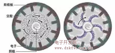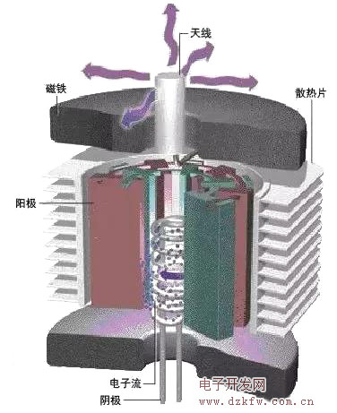 高壓電被傳送到陰極燈絲。燈絲變熱后便會(huì)發(fā)射出電子,這些電子被外圍帶正電的陽(yáng)極板吸引。一些大磁鐵塊施加的磁場(chǎng)使向外流動(dòng)的電子云旋轉(zhuǎn)。在旋轉(zhuǎn)的過(guò)程中,電子云形成輪輻狀,從陽(yáng)極板之間的每一個(gè)空腔中穿過(guò)。移動(dòng)著的電子云“輪輻”將負(fù)電荷傳遞給空腔,此后負(fù)電荷又會(huì)在下一個(gè)“輪輻”到達(dá)之前流出空腔。負(fù)電荷的反復(fù)增減在空腔內(nèi)產(chǎn)生出2.45千兆赫茲的振蕩電磁場(chǎng)。磁控管上的天線以這一頻率發(fā)生諧振,從其頂部尖端發(fā)射出微波——這和無(wú)線電傳輸天線的原理幾乎一模一樣。