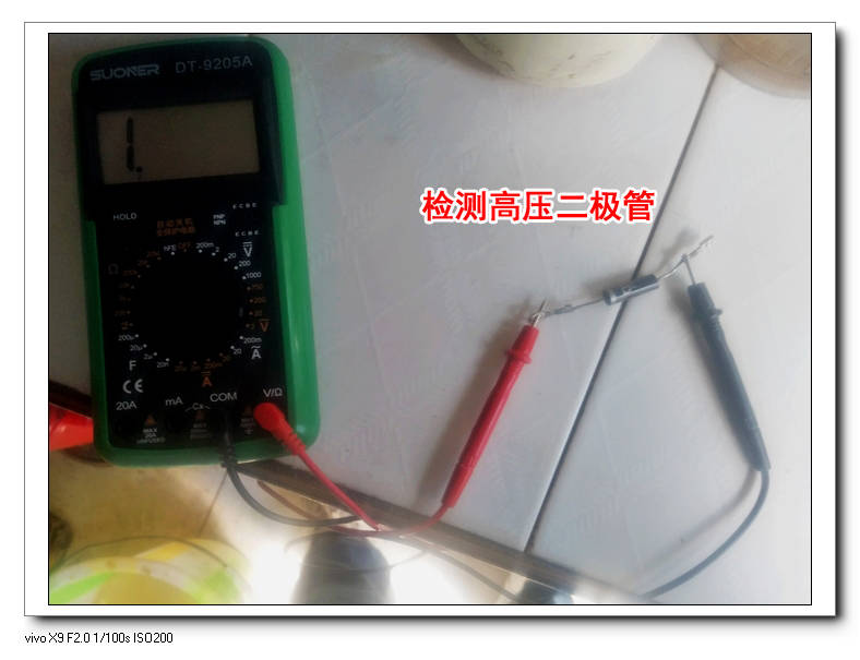 2、檢查高壓二級管是否擊穿。方法一:用指針萬用表R×10K檔測二級管兩端電阻,好的二級管正向電阻150K,反向則無窮大。