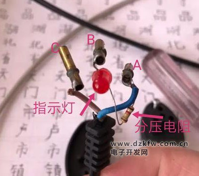 這是將電源線的插頭插入電熱水袋插孔時的電路結構,A、B、C為插接處,分別對應題主圖中的三個接線柱。