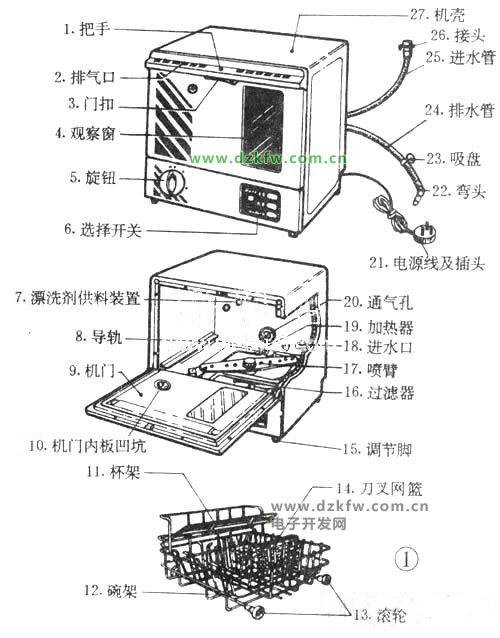 萬(wàn)家樂(lè)WQP-900家用全自動(dòng)洗碗機(jī)是一種噴流式洗碗機(jī)。其原理是利用水泵對(duì)洗凈液加壓,通過(guò)旋轉(zhuǎn)噴臂射出強(qiáng)力水流對(duì)餐具沖洗,利用加熱洗凈液所散發(fā)的熱量對(duì)餐具干燥,下圖1是外形及結(jié)構(gòu)圖。