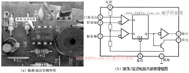 下圖為振蕩/延遲集成電路的實物外形及其內部結構圖。振蕩/延遲電路受微處理器的觸發,當微處理器有觸發信號送到HA17555的②引腳時,該電路就會由③引腳輸出一定時間的驅動脈沖,從而使蜂鳴器發聲。