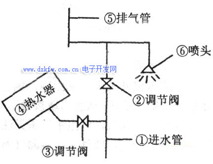 在自來水壓力不穩定地區或安裝在屋頂的熱水器,可考慮采用“頂放水法”連接,如下圖所示。打開調節閥①。將熱水器注滿水,關閉調節閥①。使用熱水時,打開調節閥①,冷水自底部進入熱水器,將熱水頂出,經噴頭⑥流出使用。水溫高低由調節閥②調節。這種方法可在水壓較大時使用。如水壓低,則采用“放水法”。使用熱水時,打開調節閥②,熱水經閥門②至噴頭⑥流出,水溫高低由閥門①調節。熱水用完后,關閉閥門②,打開閥門①,將熱水器再次充滿,供第二天使用。