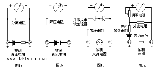 測交流電壓原理: 如圖1c所示,因為表頭是直流表,所以測量交流時,需加裝一個并、串式半波整流電路,將交流進行整流變成直流后再通過表頭,這樣就可以根據直流電的大小來測量交流電壓。擴展交流電壓量程的方法與直流電壓量程相似。