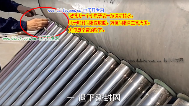 爬上房頂,先把真空管和水箱連接處的密封膠圈往下拉一節。記得用一個小瓶子裝一瓶洗潔精水,用于噴射潤滑橡膠圈,方便潤滑真空管周圍。先向左右扭動真空管的同時向上通,把真空管的底部從下面的塑料托碗中取出,注意真空管底部有一個小的凸起,不要弄破了。再往上抬起,左右轉動的同時往外拉,拔出真空管。