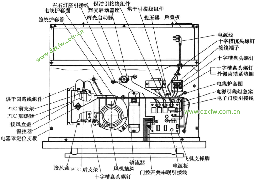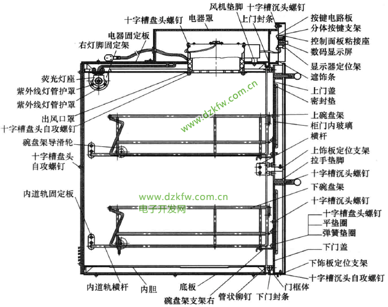 消毒柜主要由殼體(箱體)、消毒裝置、烘干裝置、控制器四大部分組成。消毒柜內部及頂部部件組成如下圖所示(以ZTD90A-1消毒柜為例)。