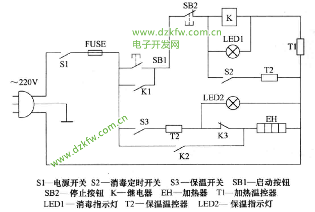 5)加熱后進行保溫,保溫電路由S3、T2及K3組成,當消毒結束后,保溫開關S3接通,市電經S3、T2及K3加至EH—端,另一端直接接零線形成回路,保溫指示燈亮。