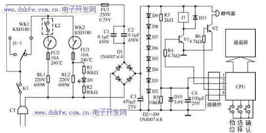 插好電源線并接通電源開關K1后,220V市電電壓經熔斷器FU1輸入后,不僅送到加熱電路,而且通過電容C1、C2降壓,再通過整流堆Q1進行橋式整流,利用二極管D2~D9鉗位,C3濾波產生5.6V電壓。該電壓不僅為繼電器J1的線圈和蜂鳴器供電,而且通過R3限流,D10穩壓產生3.6V電壓,經C4濾波后為CPU供電。