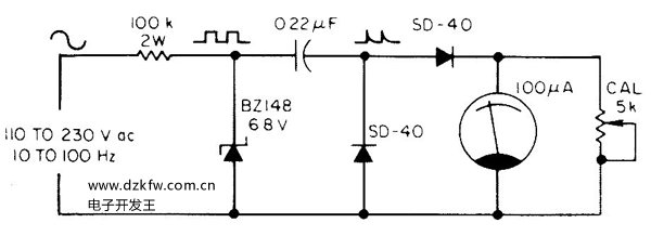 該頻率計使用一個齊納二極管來形成一個來自輸入方波。通過和5K歐姆的電位計一起校準后,這個100μA的頻率計直接以赫茲的形式讀出。
