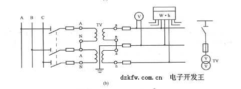 這種接線方式在三相線路上,只能測(cè)量某兩相之間的線電壓,用于連接電壓表、頻率表及電壓繼電器等。