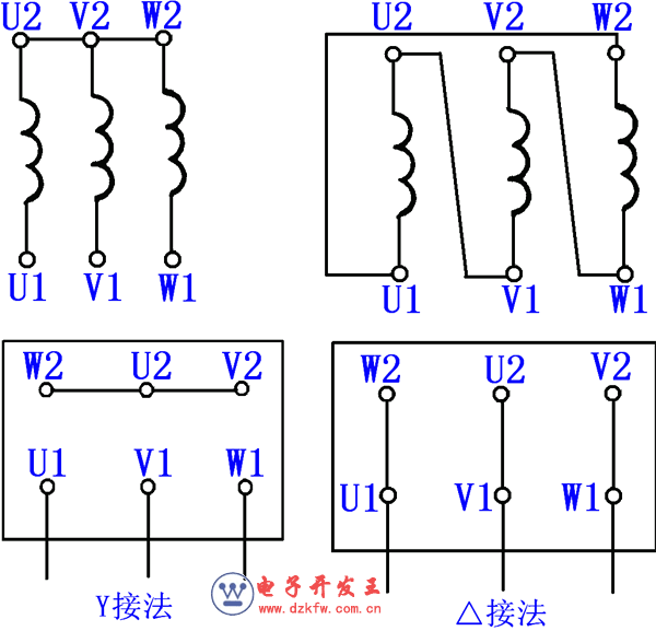 1)直觀上,繞組的連接方式不同,如下圖:連接1