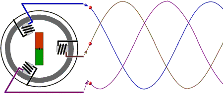 同步發電機的轉子是旋轉的,其中裝設的轉子勵磁繞組線圈兩端與兩個彼此絕緣的滑環連接,外界是通過壓在滑環上的電刷將直流電送給勵磁繞組的,當轉子勵磁繞組得電后,就會產生磁場,有N極S極。當轉子在原動機的帶動下旋轉時,三相定子電樞繞組就處在旋轉磁場中切割磁力線而感應電勢,輸出端接入負荷,發電機就會向負載供電。交流發電機主要由磁性材料制造多個南北極交替排列的永磁鐵(稱為轉子)和硅鑄鐵制造并繞有多組串聯線圈的電樞線圈(稱為定子)組成。