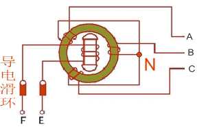 (1)轉(zhuǎn)子線圈必須通電產(chǎn)生磁場:通過F和E接柱為轉(zhuǎn)子線圈供電,轉(zhuǎn)子線圈通電產(chǎn)生磁場;