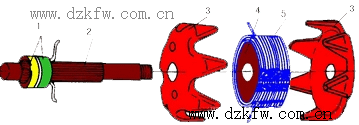 1-導(dǎo)電滑環(huán) 2-轉(zhuǎn)子軸 3-爪極 4-磁軛 5-磁場繞組