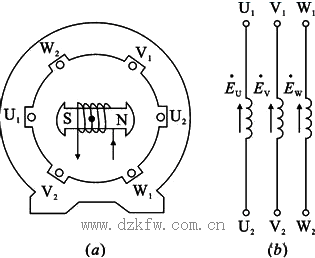 外面固定不動的部分稱為定子,在定子的鐵芯槽內分別嵌入三個結構完全相同的線圈U1—U2、V1—V2、W1—W2,它們在空間的位置互差120°,稱為三相定子繞組,U1、V1、W1稱為三個繞組的始端,U2、V2、W2稱為末端。當發動機拖動轉子以角速度ω勻速旋轉時,三相定子繞組就會切割磁力線而感生電動勢。由于磁場按正弦規律分布,因此感應出的電動勢為正弦電動勢,而三相繞組結構相同,切割磁力線的速度相同,位置互差120°,因此三相繞組感應出的電動勢幅值相等,頻率相同,相位互差120°。這樣的三相電動勢稱為對稱三相電動勢,設各相電動勢方向為由末端指向始端,如圖(b)所示。并以eU為參考量,則三個電動勢的瞬時值表達式為: