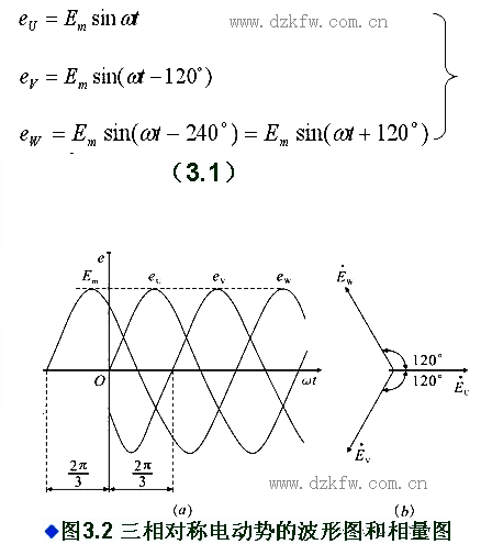 三相電源中三個電動勢依次達到最大值(或零值)的先后次序稱為三相電源的相序,式(3.1)表示的三相電源相序為U—V—W—U,即V相滯后于U相,W相滯后于V相,稱之為正序。如果相序為W—V—U—W,則稱為逆序。工程上通用的是正序。
