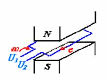 1 .單相電動勢的產生:如圖 1 所示, 在兩磁極中間,放一個線圈(繞組)。讓線圈以 w 的速度順時針旋轉。根據右手定則可知,線圈中產生感應電動勢,其方向由 U 1 ® U 2 。合理設計磁極形狀,使磁通按正弦規律分布,線圈兩端便可得到單相交流電動勢為